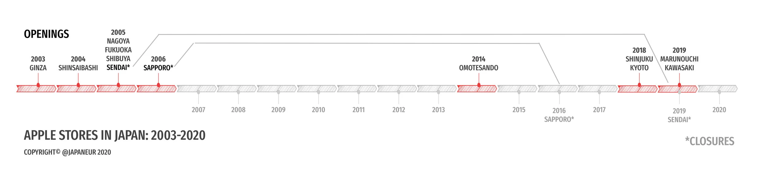 A timeline of Apple Retail in Japan, from 2003 to 2020. In 17 years, Apple has opened only 12 stores, and closed 2 (so far). Click to expand.